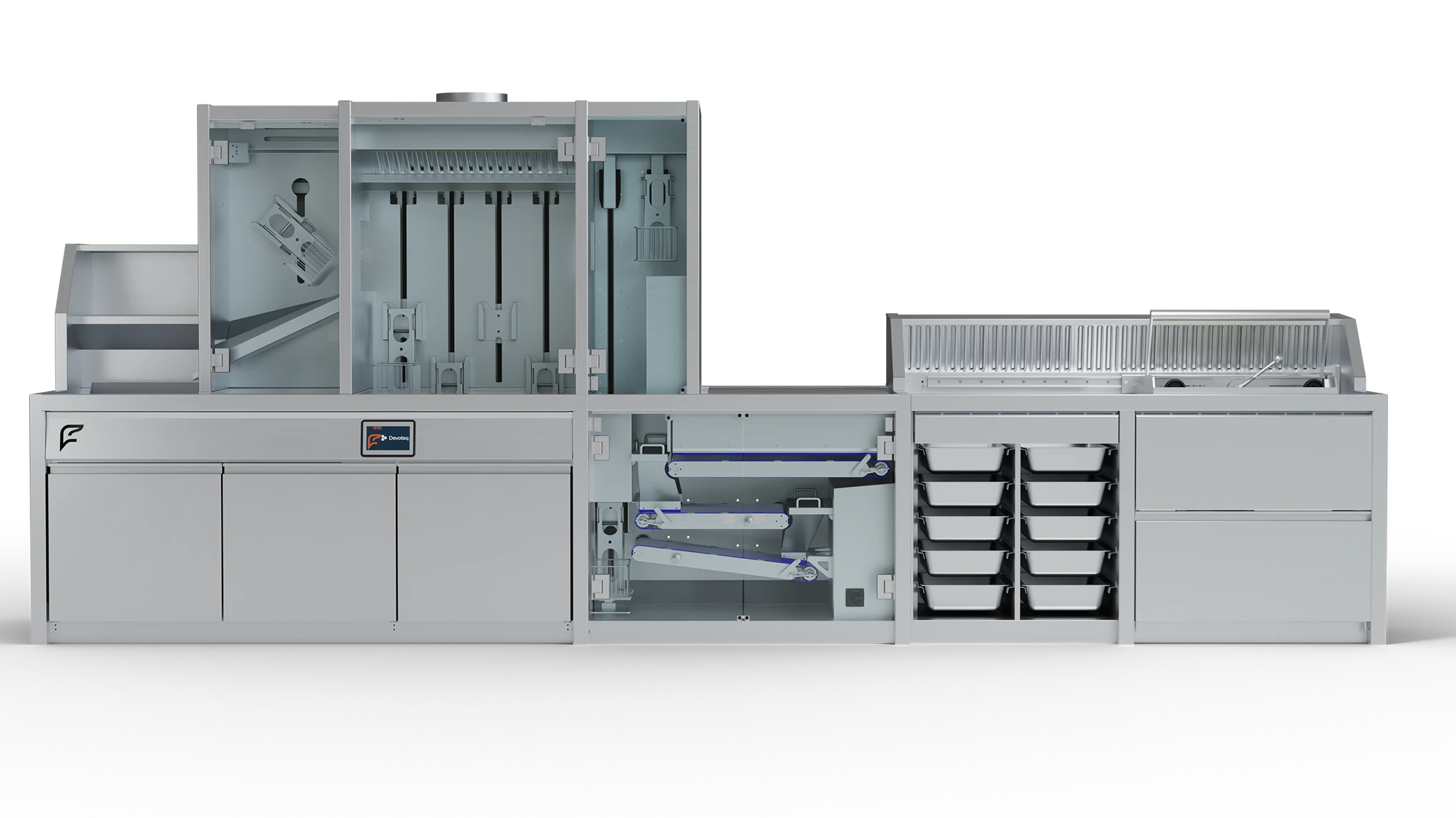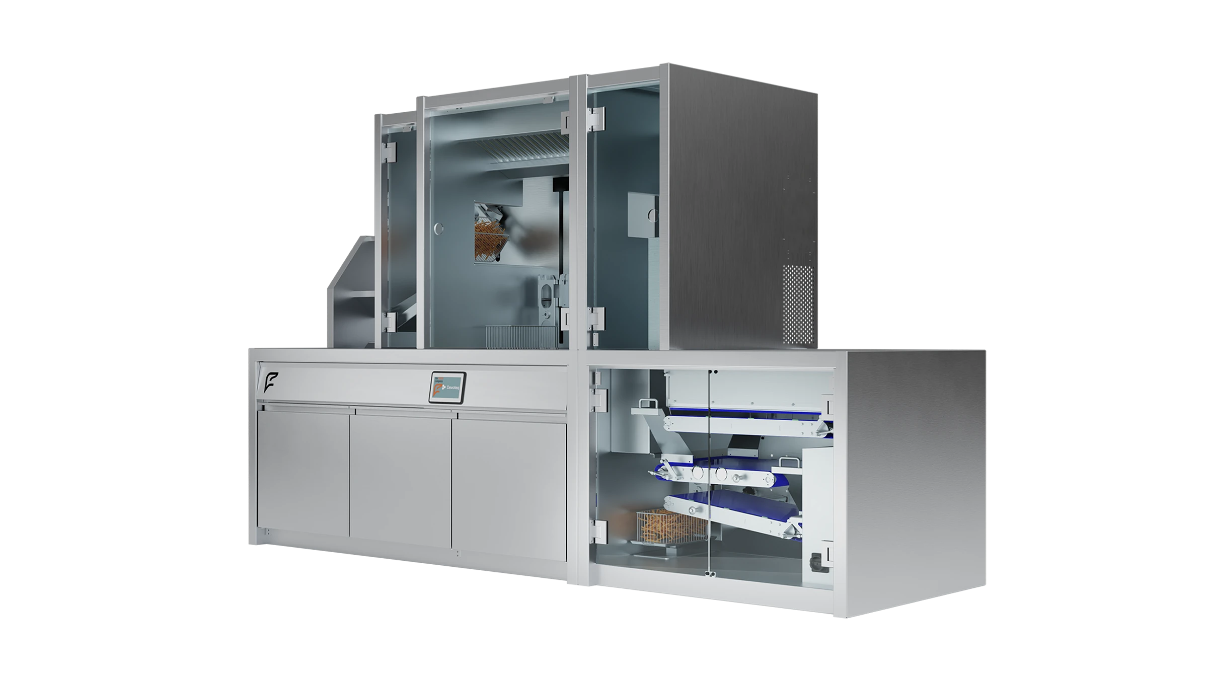 Het ontwikkelproces bestond uit korte iteraties waarbij ontwerp en bouw nauw op elkaar aansloten. Ontwerpwijzigingen zijn direct doorgevoerd in het CAD-model en vertaald naar productie. Devoteq werkte samen met The Fryer Company voor het frituurgedeelte en de bakwanden, waarbij taken duidelijk zijn gescheiden tussen automatisering en mechanische opbouw. De samenwerking met The Fryer Company is ontstaan uit een langlopende relatie die we hebben opgebouwd over de jaren dat we de bakwanden voor hen hebben ontworpen